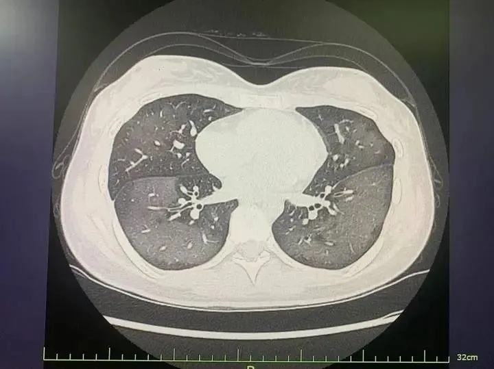 陈国庆副主任医师接诊后,迅速为涵涵安排了简单的血检和胸片检查,胸片结果提示两肺大片斑片影,已接近“白肺”,血常规则提示白细胞升高、C反应蛋白正常。